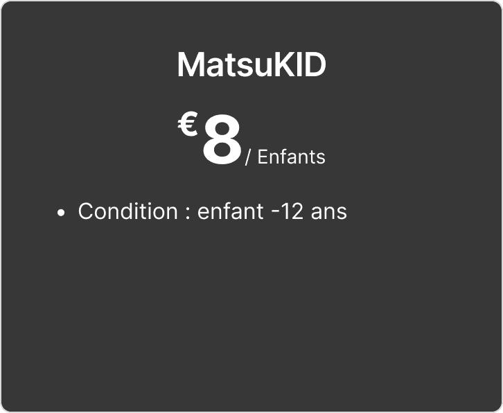 Billetterie du Festival Matsuri Bienvenue sur la page de billetterie du Festival Matsuri ! Deux options de pass sont disponibles pour vous permettre de profiter de l’événement en toute simplicité Matsuri Pass : 15€ par personne. Ce pass vous donne accès à toutes les activités du festival. MatsuKID : 8€ pour les enfants de moins de 12 ans. Un tarif réduit pour les plus jeunes festivaliers ! Chaque billet est disponible en quelques clics. Il vous suffit de sélectionner l’option qui correspond à vos besoins, puis de cliquer sur “Acheter” pour compléter votre commande.